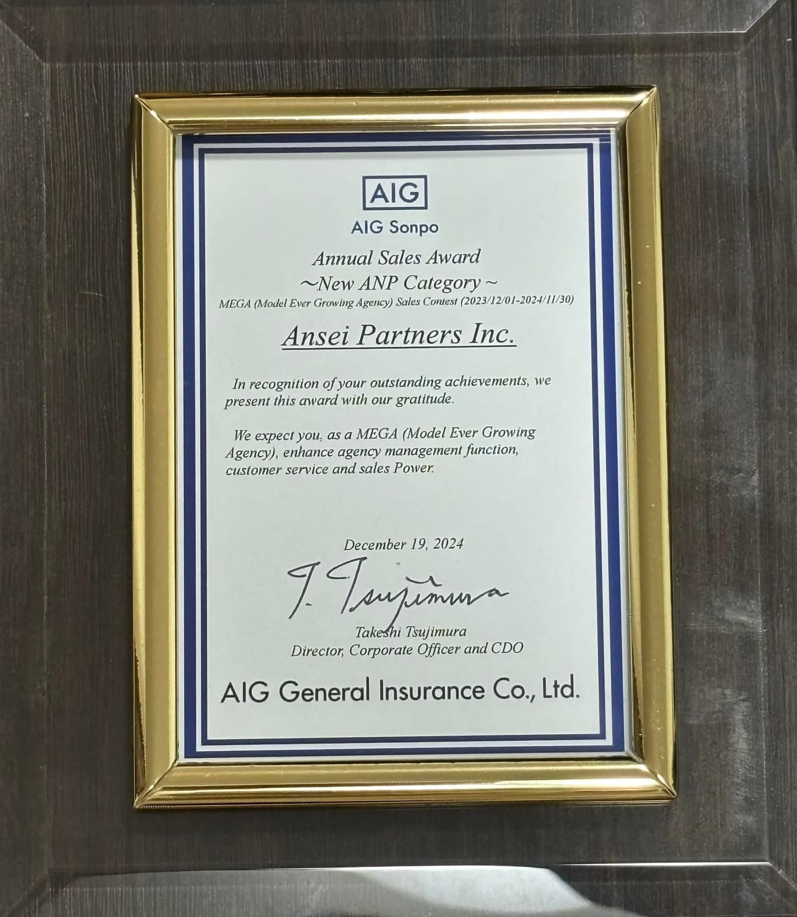 AIG損害保険から全国メガ代理店100社のうち2つの部門で弊社がトップに認定され盾をいただきました✨✨✨